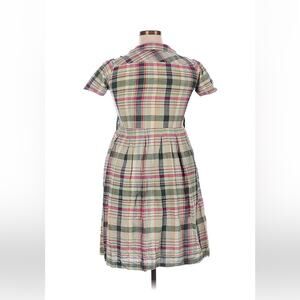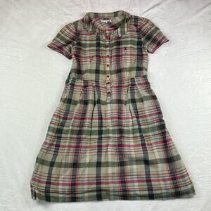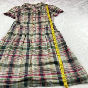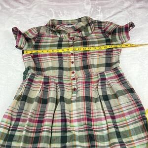 Button down shirt dress in multi colored plaid. Features red buttons, short sleeves, peter pan collar, hidden hip pockets, side belt loops, and a lace edged under slip. Sizing is foreign, and I used measurements to label a medium. As always, double check the picture measuring tape to ensure proper fit!