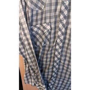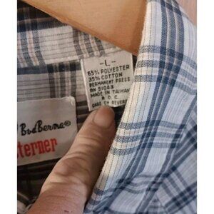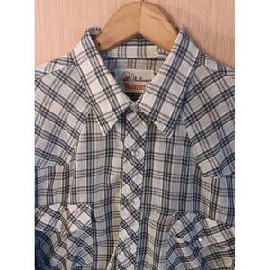 This is a vintage Bud Berma Westerner shirt for men in size Large. It features a blue plaid pattern with pearl snap closures and a collared neckline. The shirt has long sleeves, a point collar, and pockets. Made of a polyester blend, it is suitable for casual occasions and can be worn in all seasons. The Western theme is accentuated by the pearl snaps, making it a stylish addition to any wardrobe.