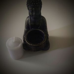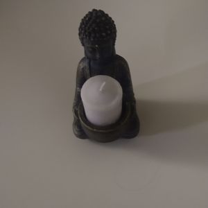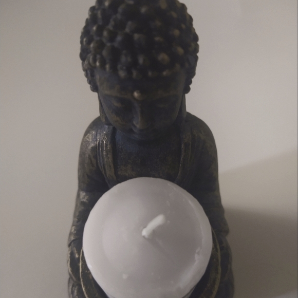 black/blue Buddha with A hint of gold. 10 inch tall holds A candle. new in bag.