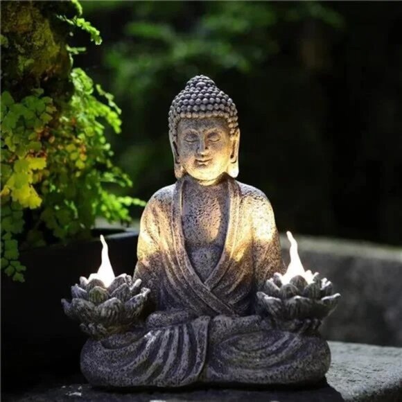 🧿Size: 11.4 in *8.6 in*5.1 in. Peaceful Buddha statue: Outdoor Garden Decorations for Sakyamuni statue sitting cross-legged together meditative pose while holding two lotus flowers with candles. Great addition for your garden!