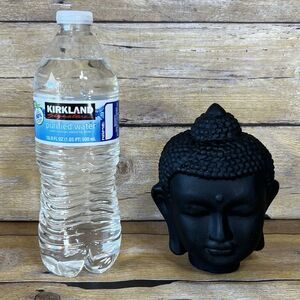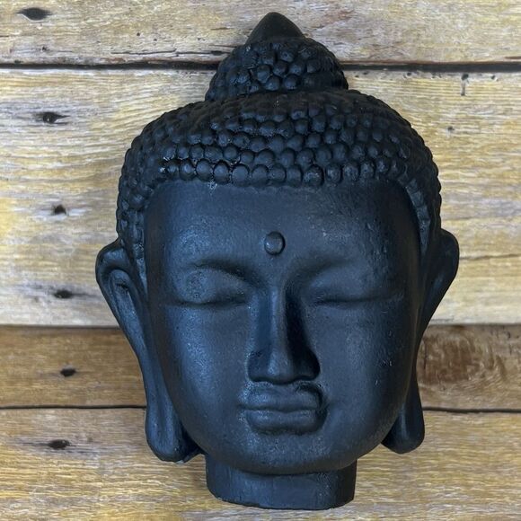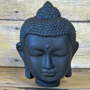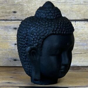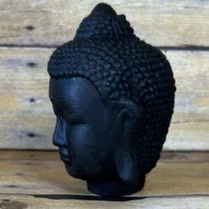 This is a decorative statue depicting the head of Buddha. Such statues are often used for home decor, meditation spaces, or as symbols of peace, enlightenment, and wisdom. The black color can symbolize protection, grounding, and the triumph over ignorance, representing the Buddha's capacity to gain wisdom and overcome adversity, Made in Plaster or Similar (Not Sure what kind Material)