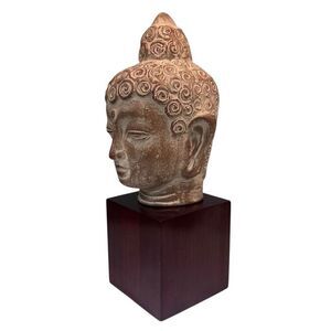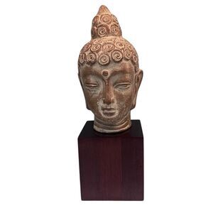 Buddha Head Ceramic Statue On A Wood Stand 12" Brown Tan Square Cube Base