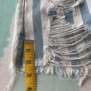 Buddy Love, Blue & White Stripe, High Rise, Distressed, Soft Denim Shorts. 5 pocket style. Zip fly with button closure. Cut off/ frayed hem. Side slits. Belt loops. Very soft and comfy, 100% cotton. Size 25. See photos for measurements to ensure fit. NWT