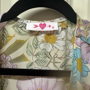 Charming maxi dress with vibrant floral design. Features pink, blue, and green flowers on a cream base.