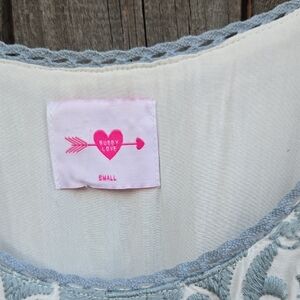 Elegant white dress with blue lace detailing. Perfect for special occasions.