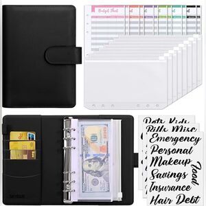 Cash Envelopes System:1pcs PU leather money saving binder,8pcs A6 6-holes binder pockets,12pcs expense budget sheets,3 sheets of category sticker labels,Budget binder with cash envelopes perfect for you to save money. 7.76 x 5.83 x 1.61 inches.