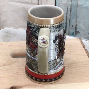 Celebrate tradition with this unique Budweiser 1988 Collector's Series Stein. Featuring iconic Clydesdale horses in a winter scene, it's a must-have for beer enthusiasts and collectors. Add this piece to your collection and enjoy a piece of brewing history with every sip.