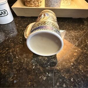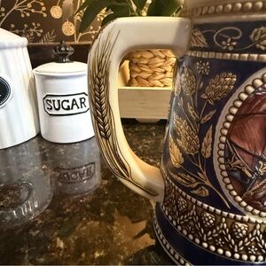 Ceramic beer stein featuring a detailed horse design. Blue and cream colors with intricate patterns. B82 - 1063