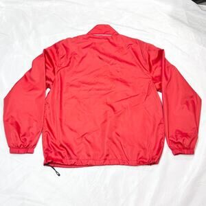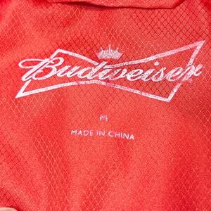 Introducing a Budweiser Jacket for men in medium, featuring a vibrant red color and a quarter zip design. This fleece jacket is gently used and showcases the Budweiser logo, making it a great choice for beer enthusiasts.