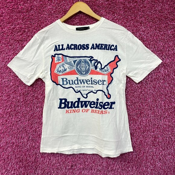Budweiser King Of Beers All Across American T-shirt size Small. Generally measures 19 inches pit to pit and 26 inches long. Amazing graphic design T-shirt, perfect for Budweiser fans and beer lovers. New never worn overstock and in great condition.