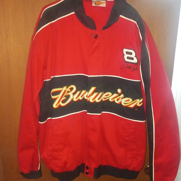 Great shape lightly worn no signs of wear Red Budweiser racing jacket with black and white accents. Features embroidered logo and number 8.
