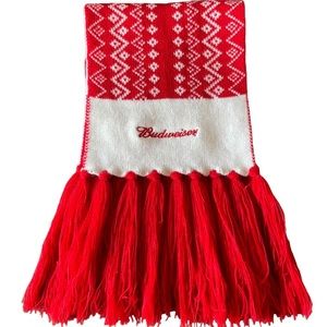 Budweiser Red White Knit Scarf Fringe Tassel Fair Isle