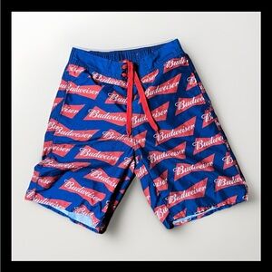 Budweiser Swim Trunks Men’s Size Small Blue Red All Over Logo