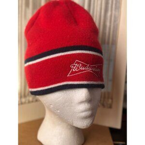 This vintage Budweiser beanie offers warmth and style with its bold red color and classic logo. Ideal for collectors or fans of the brand.