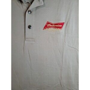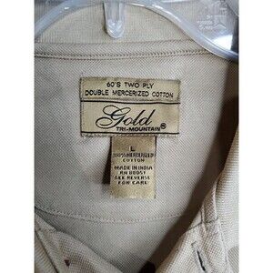 Budweiswer Clydesdales Gold Tri-Mountain Polo Shirt 100% Mercerized Cotton. Size is Large. 60's Two Ply Double Mercerized Cotton. Designer buttons. Pre-Owned in like new condition. I don't see any flaws. The shirt appears to me to have never been washed being the measurements for a Large size shirt.