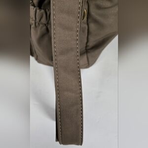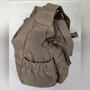 This handbag is in very nice clean condition. The faux leather is super soft ! Fully lined. The color is taupe.