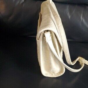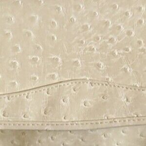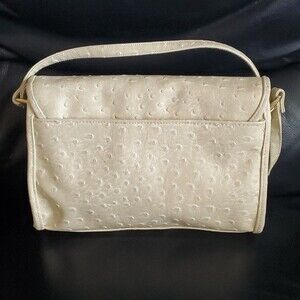 Bueno bag is faux ostrich leather - a creamy color kind of very light tan or off white depending on lighting, some people may even call it ivory. It is fab and reminds me of 60s styling. I believe this to be vintage.
