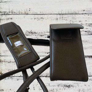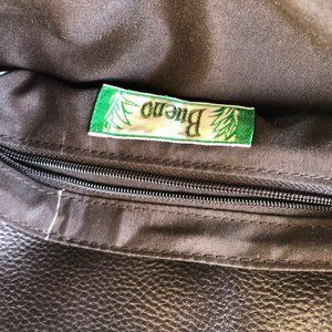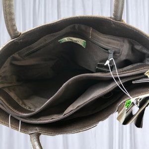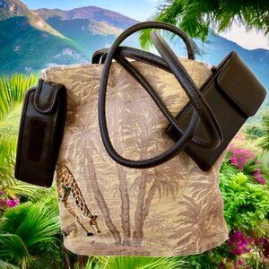 Bueno tapestry tote handbag. A giraffe is embroidered on the front. The tapestry fabic has palm trees all over. Two faux leather handles. Open top with center divider zipper compartment. Two small cases included - the phone case will NOT fit any current phones!
