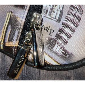 Bueno Handbag with cities around the world decorating the outside. The inside is orange. The measurements are approximately 12" x 7" x 4". The strap is adjustable with a belt buckle. The inside is in excellent condition. No marks or blemishes. There is a zipper pocket and 2 open pockets inside the main pocket. The outside has a zipper pocket and a zipper pocket where the inside is wallet like. This is a beautiful handbag.
