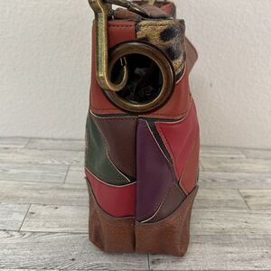 Bueno Patchwork Style Vegan Leather Bag New With Tag. Bag features brass tone hardware, top snap closure with triple compartments (middle compartment is zippered), 2 accessory pockets and zippered interior side pocket. Small knick on back top right side as shown in last photo. Measures 13” x 9.5” with a 10” strap drop.