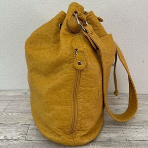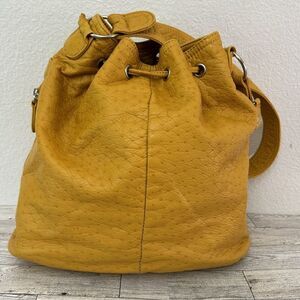 Bueno Vegan Leather Ostrich Print Embossed Hobo Bag. Super soft bag, mustard yellow color. Lots of exterior pockets. Silver tone hardware with drawstring closure. Interior features zippered pocket and 2 accessory pockets. Excellent preloved condition.
