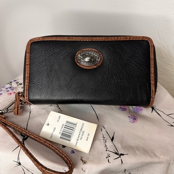 NWT. Vintage & Deadstock. Bueno wristlet wallet in black & brown leather. Complimented by silver toned hardware.
