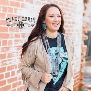 This light Crazy Train Fringe Blazer has fringe across the back and down the arms. This jacket feels amazing! Suede look and feel! There is a black Aztec print on the back of the jacket.