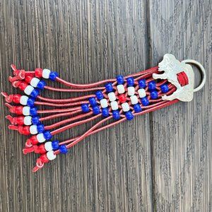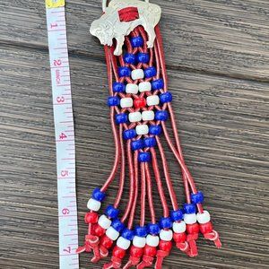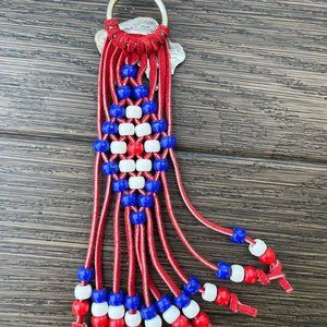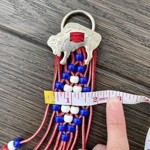 Braided red leather with pony beads. Buffalo buckle with ring back