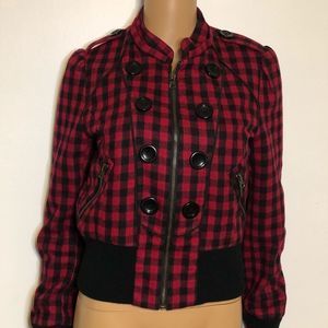 Absolutely gorgeous red and black checkered plaid jacket with bands around the waist and wrists.