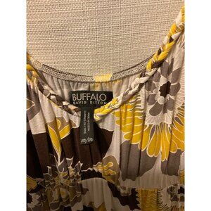 This sleeveless dress by Buffalo David Bitton features a vibrant yellow and brown floral print. Its lightweight fabric and flattering fit ensure comfort and style.