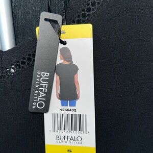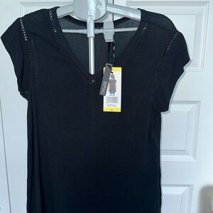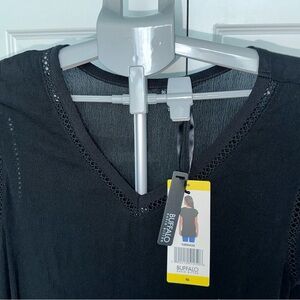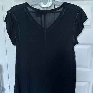Chic black blouse with V-neck. Features short sleeves and delicate detailing. Ideal for versatile styling.