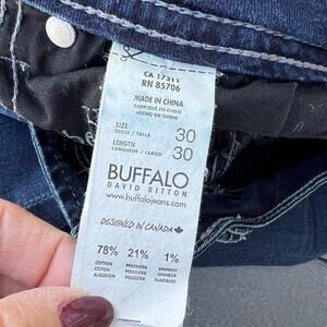 Buffalo, David Bitton, Brady-X, Straight Stretch 30 x 30 jeans, exclusively for Buckle Dark blue, no distressing. 78% cotton, 21% polyester, 1% spandex.