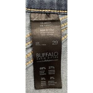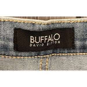 This is a Buffalo David Bitton Cadby High Rise Denim Skirt in size 29 with a light wash color and zipper front closure. Made of polyester, spandex, viscose, and cotton, this mini skirt features a solid design with a high rise waist. It is suitable for various occasions like travel, parties, and casual wear, and has accents of zipper detail. The skirt has a stretch fabric type and is designed for all seasons with an American Bohemian theme. Waist measures 16 inches across. Top to bottom is 16 inches.