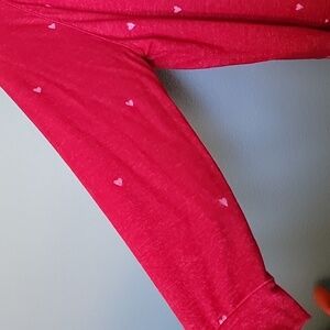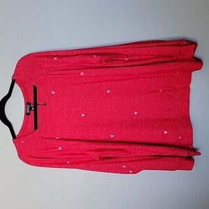 Red with small light pink hearts all over. Very soft fleece feel fabric and does stretch. Plus size sweater top. Casual, vibrant, valentines day, girly, feminine, colorful, love, romance, romantic, curvy, plus