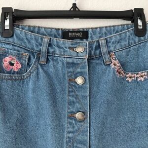 Buffalo David Bitton Floral Hibiscus Embroidered Denim Buttoned Down Jean Skirt