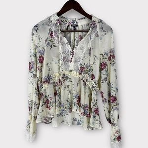 Chiffon Blouse Small. New with tags. Sheer chiffon material. V-neck with tie closure. Lace and ruffle accents. Long bell sleeves. Cotton and polyester.