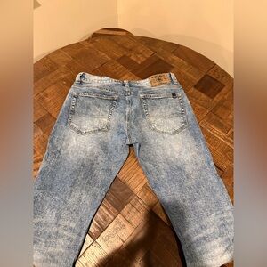 Light blue denim jeans with leather brand patch. Stylish and versatile.