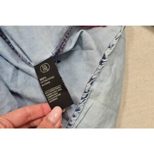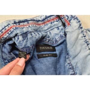 This Buffalo David Bitton men's button-down shirt features a stylish light blue acid wash, offering a unique and edgy take on classic denim. Made from 100% cotton, it provides a comfortable and breathable feel. The shirt is designed with a slim fit for a modern silhouette. Key details include distressed elements, such as rips on the front, frayed edges, and patched elbow areas with contrasting gray fabric, adding to its rugged appeal. It has a full button-down front with distressed metal buttons, a single chest pocket, and a classic collar. This shirt is a men's size XXL/TTG. It is in good used condition, with intentional distressing as part of its design. Made in India. Perfect for casual wear, pairing with jeans, or for a distinctive layered look.