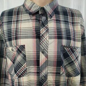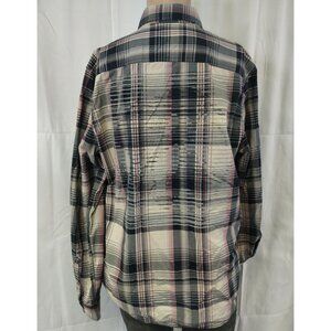 Offers a long sleeve shirt with a unique design on the back of the shirt and blue, pink, grey, and beige plaid design all around. Made of 100% cotton material. Measurements are shoulders 19", chest 46", length 34", and sleeves 25". Excellent condition. This item has been cleaned, sanitized and deodorized.