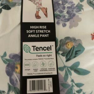 Soft stretch ankle pants with vibrant floral pattern. Features a mix of colors.