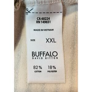 Buffalo David Bitton T-Shirt Dress in size XXL with beige and green stripes. This casual midi dress features a classic crew neck and short sleeves. Measurements are 25.5" from armpit to armpit, 3" sleeve length, and 36" from neck to hem. Made for comfort and effortless style, this dress is perfect for everyday wear. It does not have pockets. In good used condition, it’s a great addition to any wardrobe for a relaxed and versatile look. Ideal for casual outings, layering, or lounging.