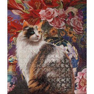 In a world of vibrant blooms and captivating feline gaze, this puzzle draws you into a serene moment of artistry. As you piece together this vibrant tapestry, each section reveals exquisite details—from the delicate petals to the cat's majestic fur. An enchanting puzzle journey awaits.