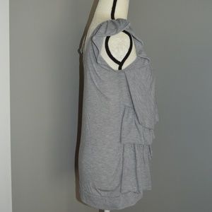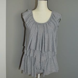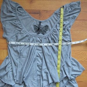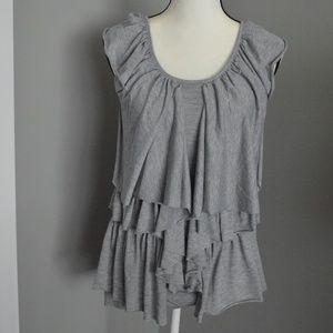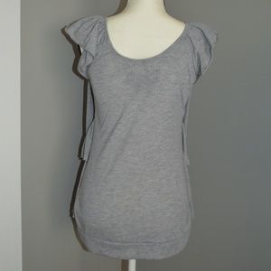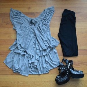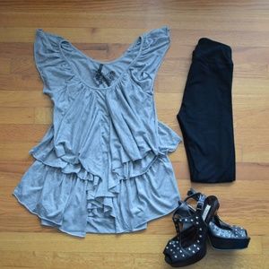 Buffalo Grey Ruffle/Pretty Top. great/used condition. very nice/comfortable material. This top is soooo fun and girlie- really cute ruffle design. It can be styled soooo many cute ways- with leggings and heels, casual with your fave Birkenstocks, or business/girlie casual under your blazer. measurements in photos, photos part of description. pet free/smoke free home. open to offers.