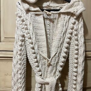 Hooded with open knit and ball detail throughout. In excellent used condition with some pills and minor pulls. Wool and Acrylic. Belted. Toggle closure with decorative toggle.