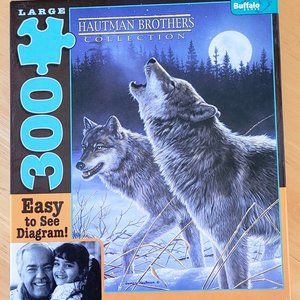 Buffalo "Howling in the Moonlight" 300 piece large puzzle. Puzzle is a Hautman Brothers Collection. Has an easy to see diagram of the puzzle included. Size is 15" X 25". The puzzle is large for easy to hold and easy to see. It has thick premium board mean pieces to snap into place easy. All pieces are there and in excellent condition.