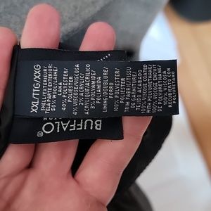 Buffalo Jacket color gray with black accent and trim. Jacket has no rips or snags all buttons and zipper work. Jacket is button closer has 2 inside pockets 1 zipper pocket on front and the normal hand pockets. The length of the jacket from collar to bottom measure 37 inches. Across the shoulders is 21 inches and armpit to armpit is 27 inches.