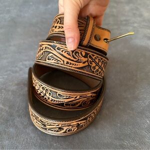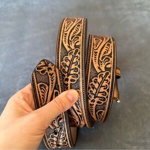Beautifully embossed leather belt with intricate designs. Features a striking gold buckle. Perfect for adding a vintage touch to any outfit.