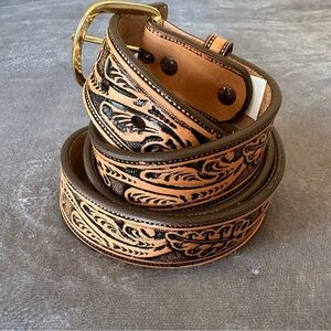 Buffalo Leather Billfolds Men’s Embossed WESTERN Cowboy Tan Gold Buckle Belt 48