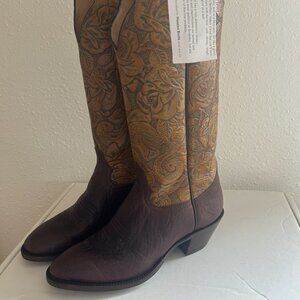 These boots are handmade by Carter's Boots. They have a solid buffalo leather construction inside and out. The retail price of these boots was $450.00. Still have the original tags on them. There are a few minor scuffs on the bottom of the sole from being tried on, but otherwise have never been worn.