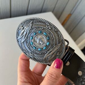 Buffalo nickel buckle, western belt buckle, cowboy core, turquoise buckle, rodeo style, Southwestern fashion, Americana vintage, rustic glam, boho western, statement accessory, silver-tone buckle, country chic, heritage style, festival fashion, cowgirl outfit, native-inspired, collector’s buckle, 1970s revival, Western Americana, rockabilly